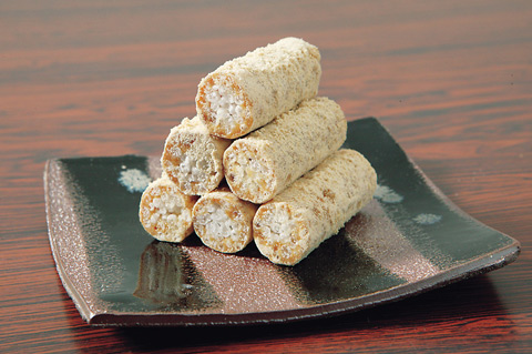 熊谷では、天保年間(1831-1845)に成田用水の水役人をしていた水野源助が中山道沿いに茶店「水戸屋」を開き、故郷水戸の「吉原殿中」を参考にした干菓子「五嘉棒」を作ったとされています。その後、熊谷五家宝の祖とされる高橋忠五郎(1809-1880)が改良を加え、明治14年頃、水戸屋の水野丑松(1852-1914)、風間堂の風間浅五郎(1855-没年不詳)が修行に訪れ、現在の五家宝の原型を作りました。