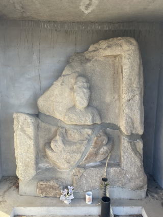 石仏は、風化が進んでおり、3つの破片がコンクリートで接合され、覆い屋に納められています。