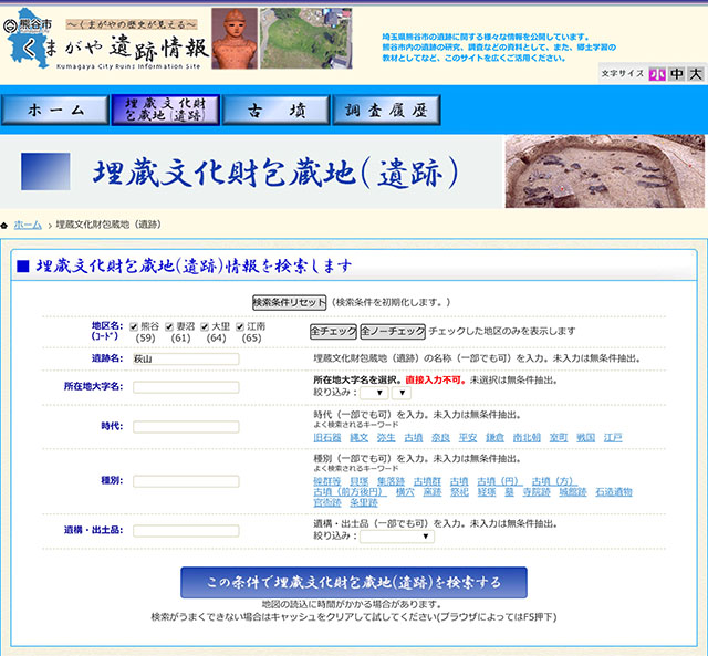 埼玉県熊谷市遺跡情報サイト「くまがや遺跡情報」にて、埋蔵文化財包蔵地や隣接地など関連情報が確認できます。