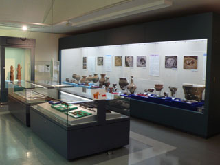 展示室 収蔵品の中から資料を選んで随時公開します。また、テーマを絞った企画・特別展示も行います。市域で発掘され、県を代表する寺内廃寺跡の建物復元模型の展示されています。 |