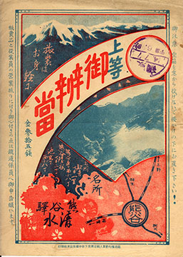 左上に雪の積もった山並みのイラストと「旅装はお身軽に」、右下には長瀞の石畳の写真と桜、鉄道路線図のイラストと「名所 上岡観音南一里 熊谷寺西小八丁 熊谷桜堤南二丁 池亭西小八丁」、「熊谷驛 清水」 「金参拾五銭」と印刷されています。右欄外には「御注意 空箱を窓から投げないで腰かけの下にお置き下さい!」、左欄外に「販売品と従業員の営業振りに付き御心付きの点は鉄道係員へ御申告願ひます。」、欄外下には「鉄道構内営業人組合東京下谷中根岸山水社印行」と印字されています。
