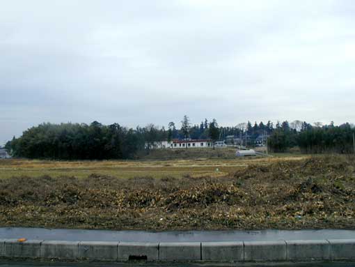 和田川沖積地より江南台地を望む。赤い建物の奥が今回の調査地点です。