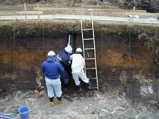 中央の土壌を、エンビの雨樋で受けて採取しています。ボーリング機械を使わずに、手軽にできる方法です。