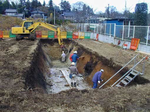 トレンチは、幅5m、長さ20m、深さ3m程で、法面(壁)は約60度の角度をつけています。