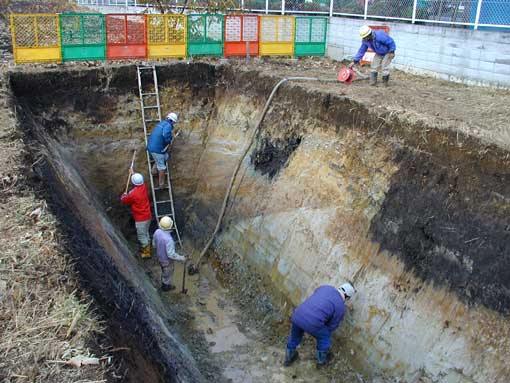 粘土層の上面より出水があるため、水中ポンプで排水します。