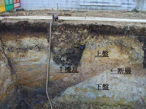 きれいに地層がずれている状況が確認できます。中央上部の黒い落ち込みは、近年掘られたゴミ穴です。