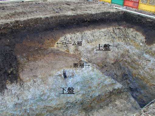 左側が下盤、右側が上盤。上盤側の左側に、わずかに黄色い土(関東ローム層)が確認できます。下盤側との摩擦でずれきれずに、ひきずられた痕跡と思われます。