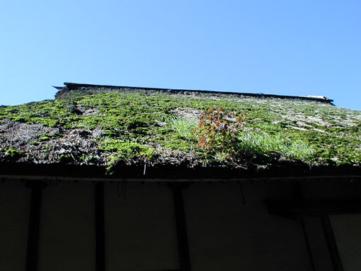 北側は日が当たらず、全体に苔が生えたり、飛んできた木の実が芽を出したりしています。また、雨落ちの溝が部分的に深く茅を抉り、カラスが、茅を引きずり出しては中の虫を食べるため、他の面の屋根に比べ傷みがひどくなっています。