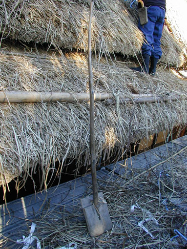 この雪かきのような道具は、「ガギ」と呼ばれ、茅を葺く時に、茅を外側から押して整える道具です。