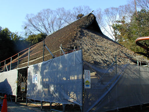 作業のため、家の周りに屋根の高さに足場を組んだところです。